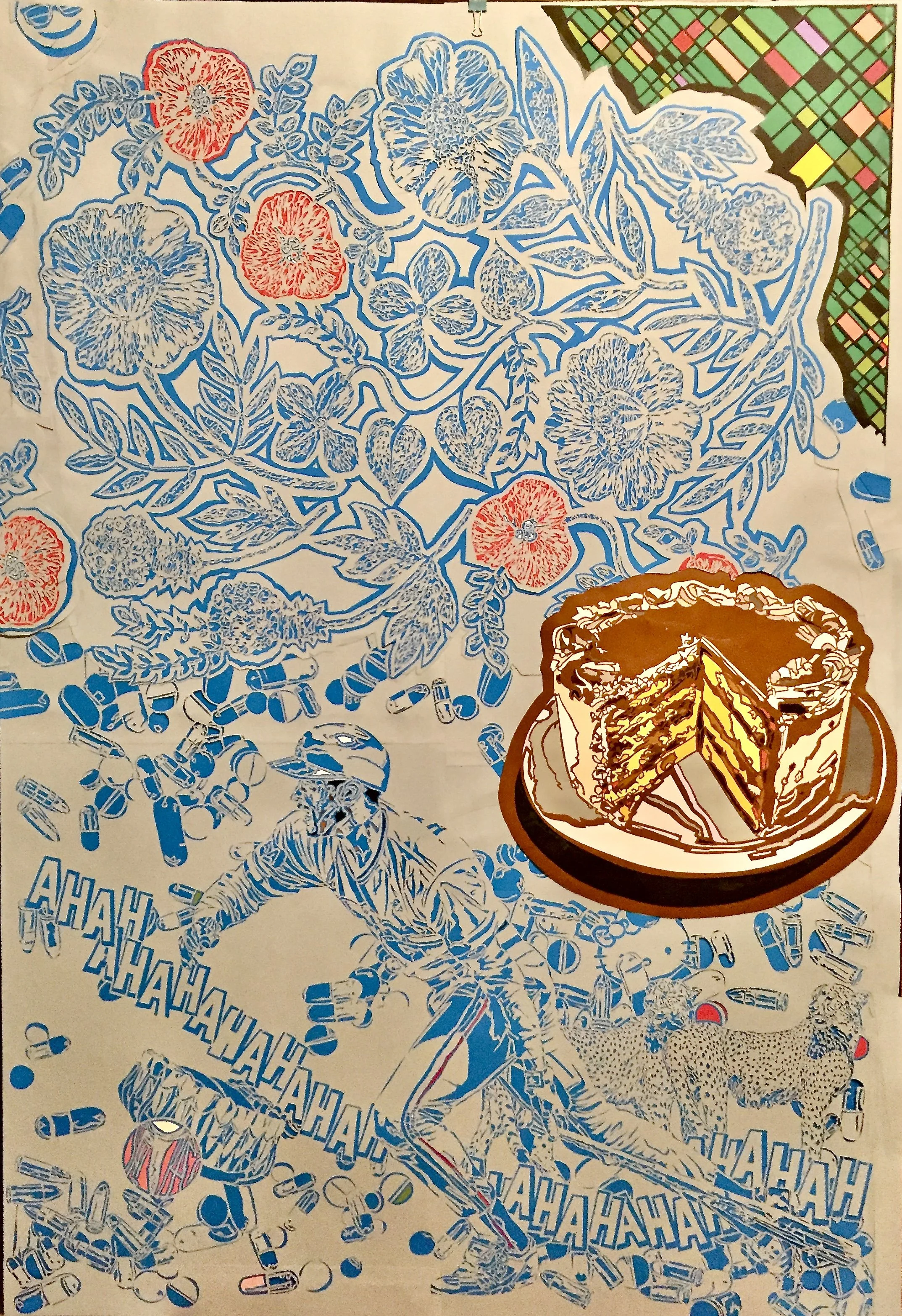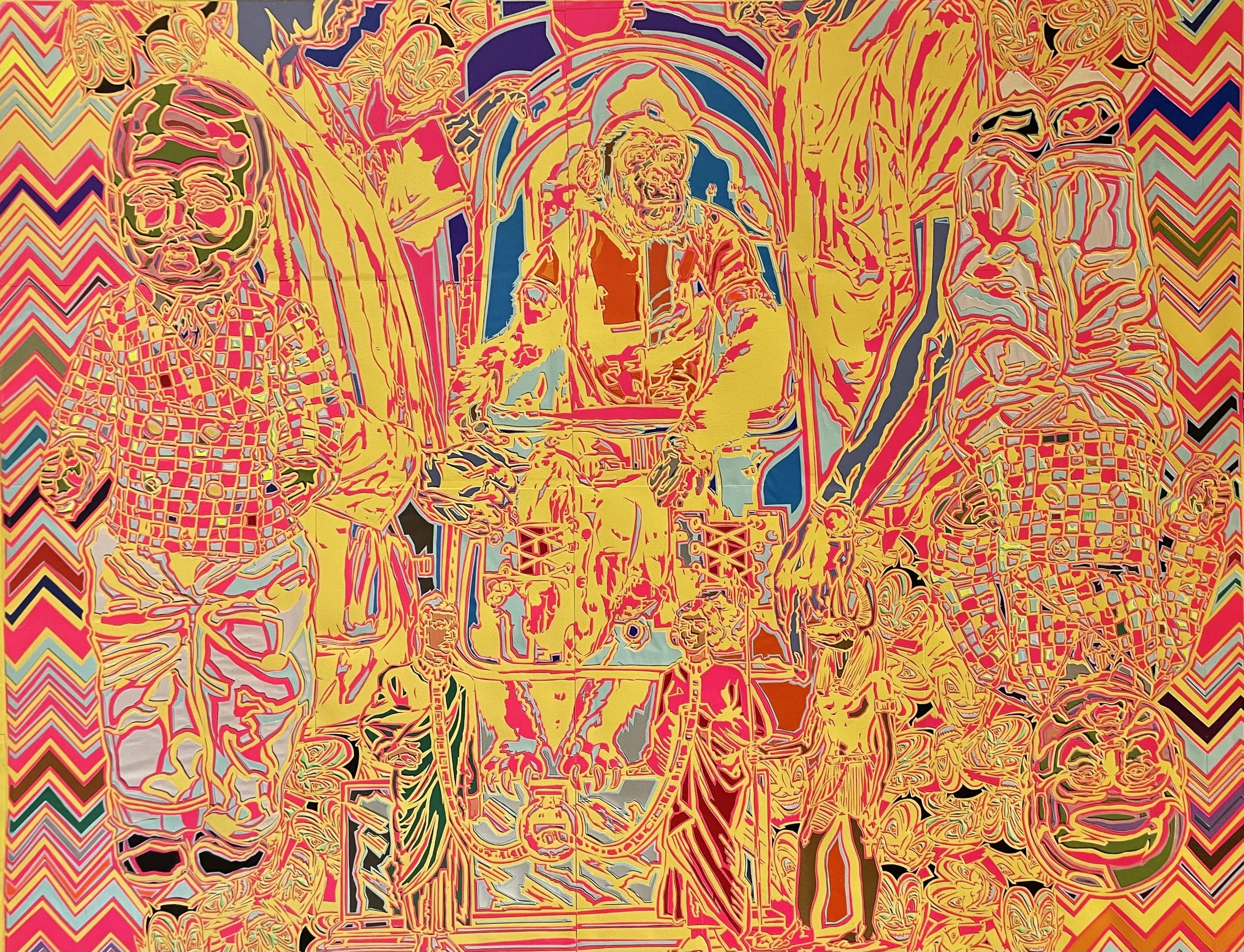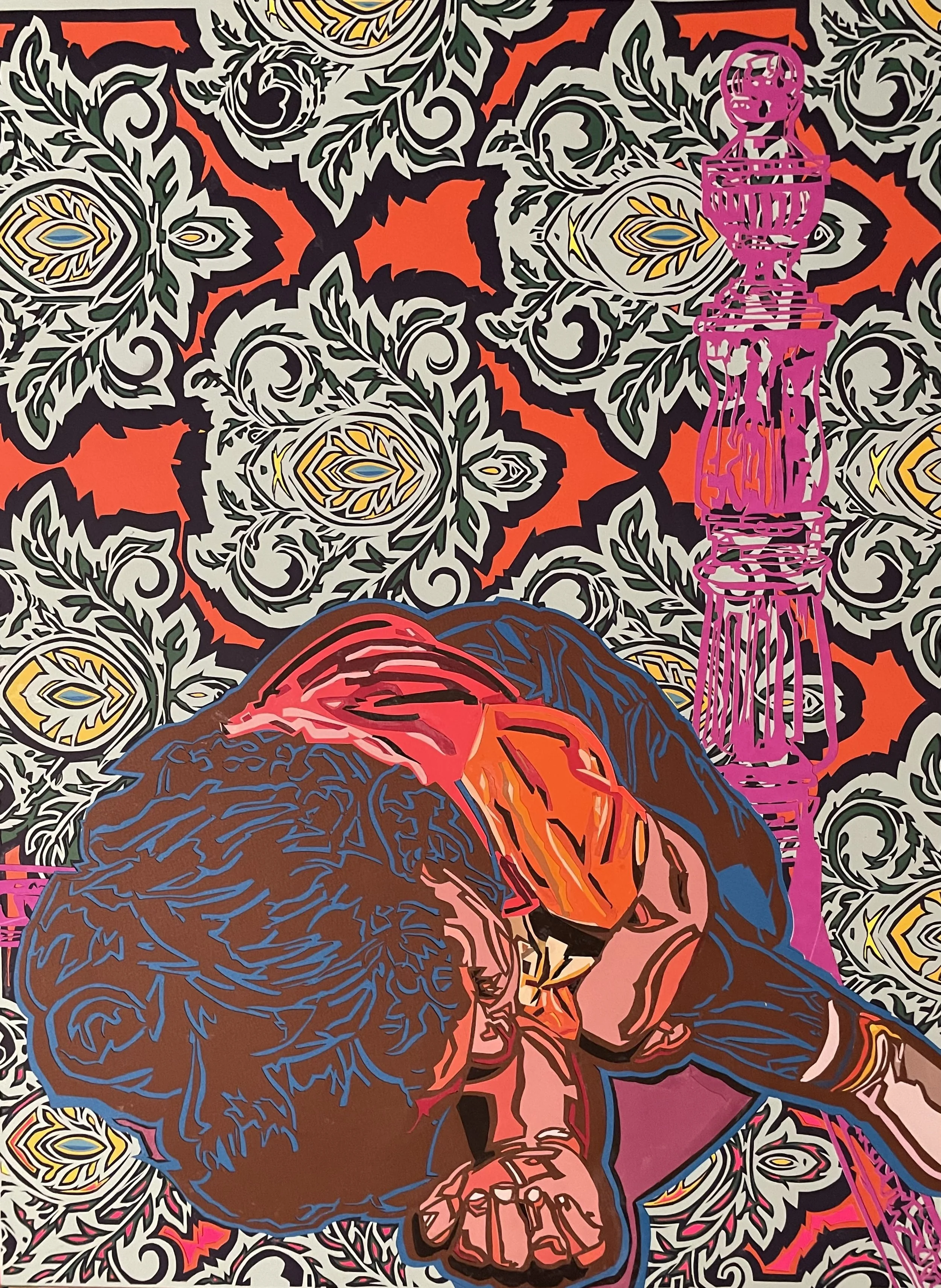 William R. “Dooby" Tomkins Jr. creates complex, hand-cut layered paper pieces. His pieces explore vibrant colors, pop-culture iconography, and layered paper. His intricate, hand cut pieces create a discourse between flat paper and the space it inhabits when layered. “Cowboy,” a 30” x 30” standout piece in the show, perfectly demonstrates such a discourse, with its bright, multi-colored depiction of a vintage cowboy extending out from a flat swirling black and white background.
