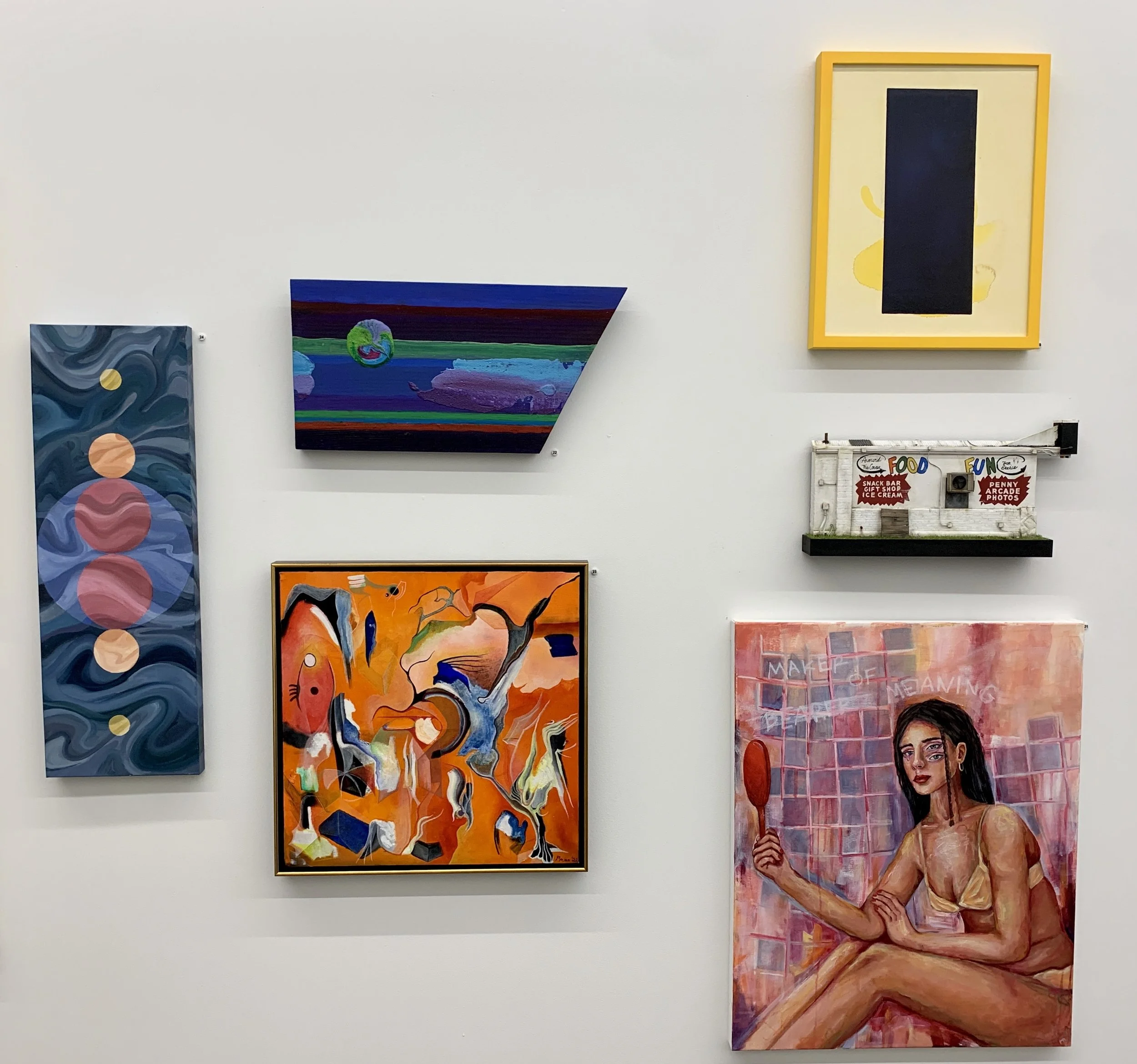 Works by Amber Lelli (both pieces on the far left), Caleb Mulholland (top center), Alison Underwood (bottom center), and Andy King (right)