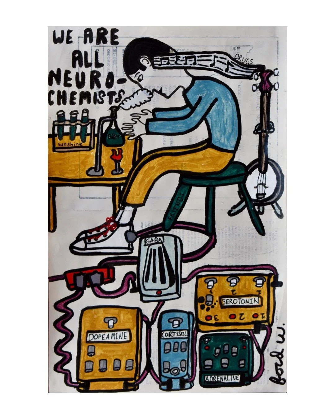 Ford creates playful, imaginative, and often humorous pieces that have been described as folk, outsider, or naive art. Themes in his work frequently relate to aspects of mental health, various absurdities of society, or information learned from his years spent obsessively researching anything & everything as a means of avoiding his feelings.
