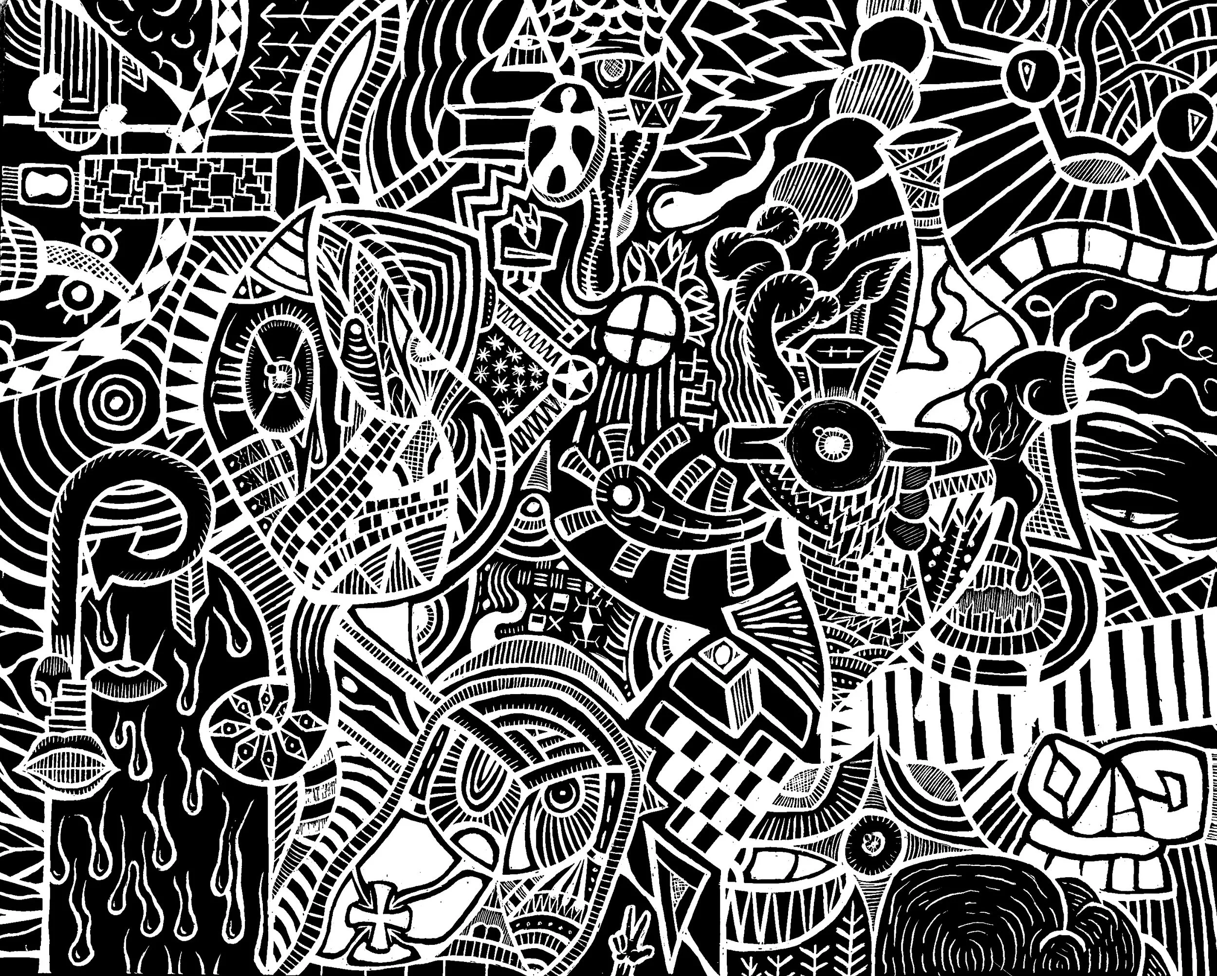 Mason Peters is a self-taught artist with a keen sense of composition and instant mark-making. In his show, Journey Through a Zentangled Mind, Peters—who is influenced by automatic thought and music—uses scratchboard to captivate funky, playful, surrealist scenes that display motion and the flow of emotion. His pieces are intricate, multi-faceted, and overwhelming in the best possible way. They transport you into a wonderful world of chaos and allow you to dive deep into the artist’s psyche. Scratchboards are an unforgiving medium that many artists choose to avoid, but not Peters. He uses the permanence of line in a provoking way, displaying the high contrast of these black and white works of art.