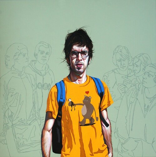 Born in Los Angeles, Ian has lived a semi nomadic lifestyle with stints in Philadelphia, Auckland, the Pacific Northwest, and a half dozen places in between. He is currently setting roots with his wife and four daughters, in Nashville, Tennessee. Ian is a playful realist painter. His work depicts near photorealistic subjects, of everyday people set in bright minimalist color fields and expressive line work. Identity, emotion, expression, and humor all intermingle on the canvas. Among his influences are Maira Kalman, Wassily Kandinsky, and Chuck Close. Ian is a graduate of BYU Visual Arts.