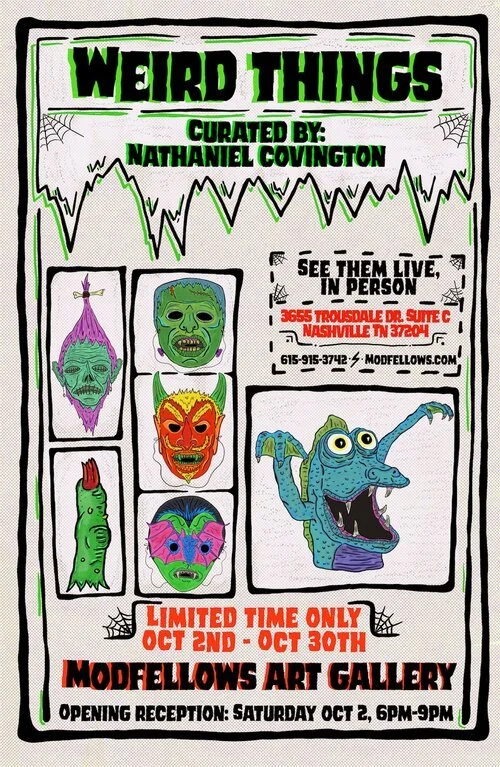 Nathaniel Covington is known for his delightfully spooky papier-mâché sculptures and psychedelic monster painting, influenced by cult film, monsters, toys, and comics. Covington is a master of mixing Folk Art with the contemporary and allowing us the space to escape from our human reality and enter a mystical land of colorful, loveable critters.